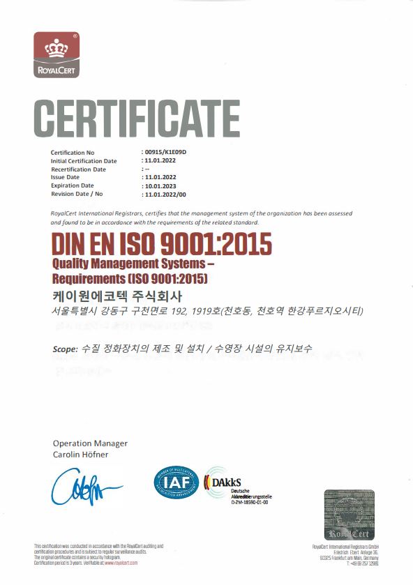 주요인증현황 ISO 9001 인증서 (2022.01.11.~2023.01.10.)
