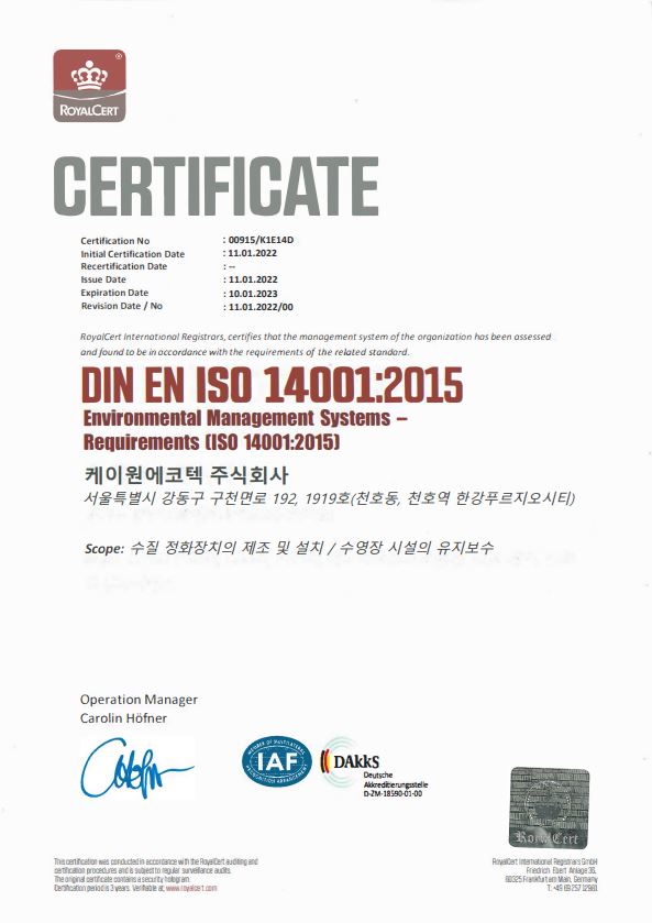 주요인증현황 ISO 14001 인증서 (2022.01.11.~2023.01.10.)